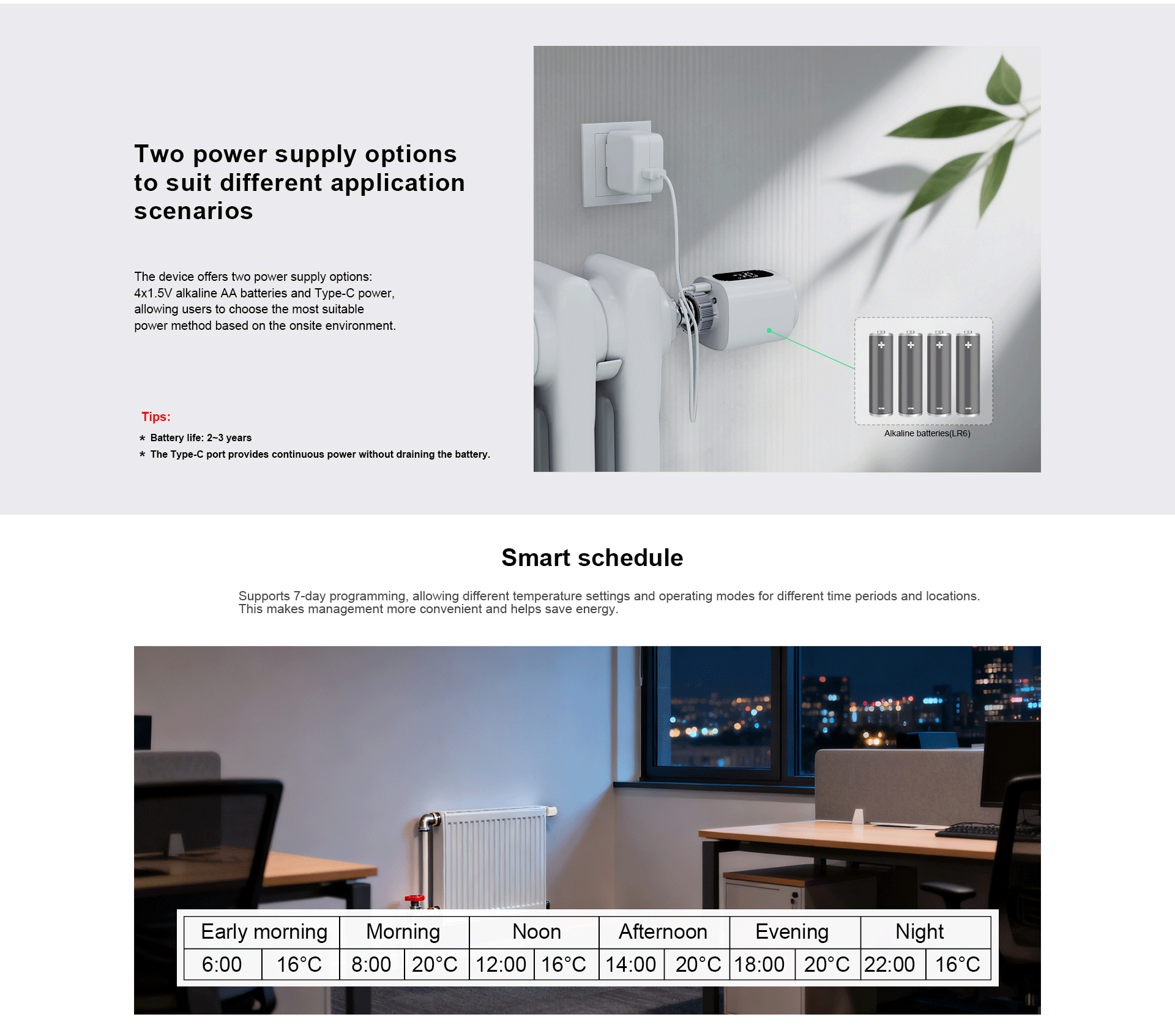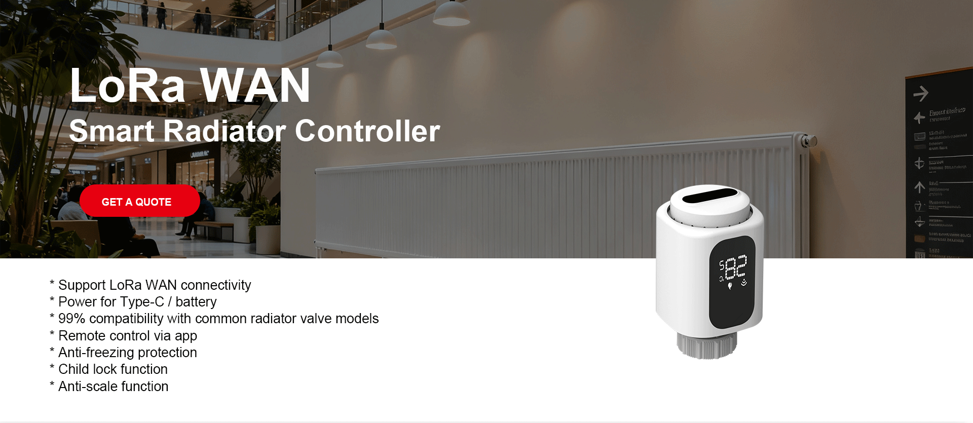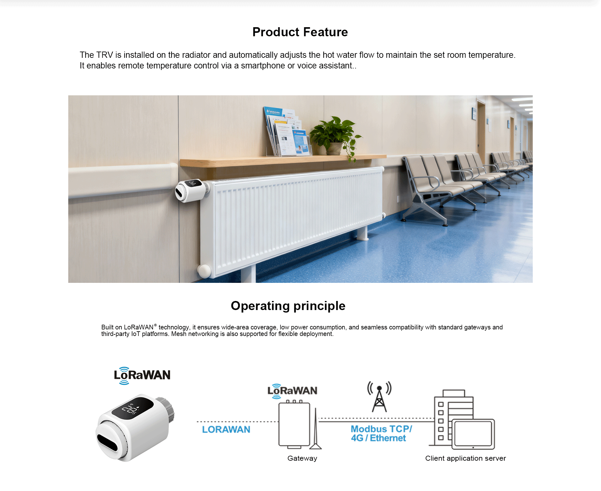 El controlador inteligente de radiador LoRaWAN es un dispositivo inteligente de control de calefacción que utiliza tecnología LoRaWAN para ajustar remotamente la temperatura ambiente mediante una aplicación móvil o una plataforma IoT. Funciona con batería y con cable tipo C, y es compatible con el 99 % de los modelos de válvulas de radiador.