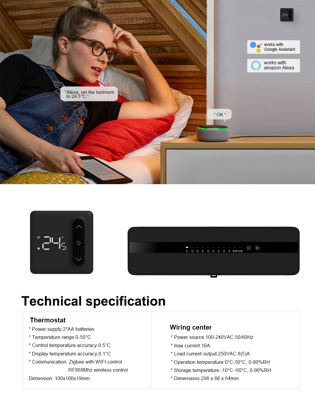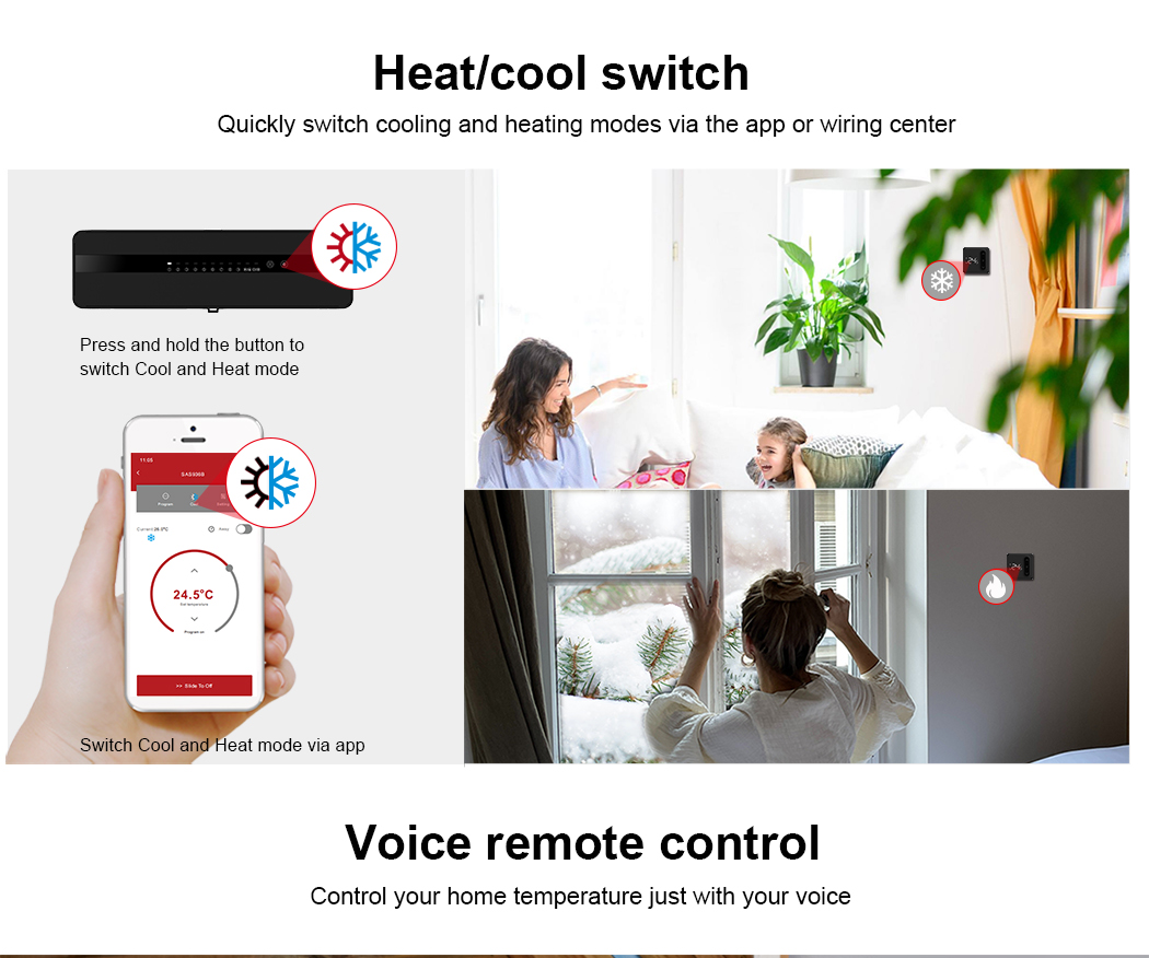 El diseño inalámbrico simplifica la instalación, lo que lo hace ideal tanto para proyectos de obra nueva como de renovación. Los usuarios pueden ajustar la temperatura interior a distancia mediante una aplicación móvil, lo que mejora la comodidad y la experiencia de vida inteligente. El control preciso de la temperatura ayuda a optimizar el consumo de energía y a reducir los costes operativos.